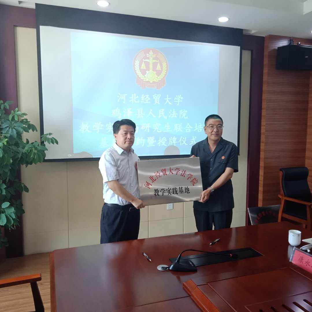 5月29 日上午,pp电子游戏官网与鸡泽县人民法院联合举办共建“教学实践与研究生联合培养基地”签约授牌仪式暨座谈活动。pp电子游戏官网党委书记武玉鹏、院长王利军、硕士生导师、教授张亚军、副教授张永进;鸡泽县委常委、政法委书记、群工部部长刘志强;鸡泽法院党组全体成员及干警代表出席签约仪式。