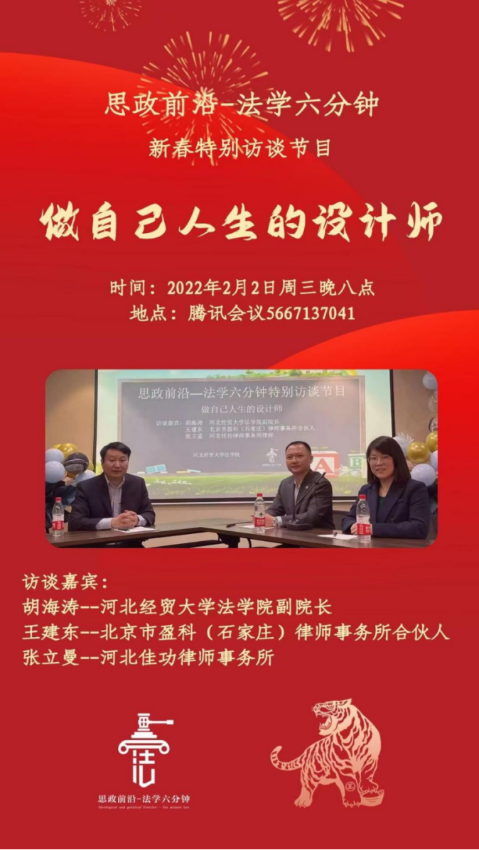 本期为同学们带来的是法学六分钟的特别节目——做自己人生的设计师。作为首次特别栏目,我们有幸邀请到了北京盈科(石家庄)律师事务所的合伙人王建东律师,以及河北佳功律师事务所的张立曼律师,并由pp电子游戏官网副院长胡海涛老师作为本次活动的主持人,与嘉宾进行访谈交流。