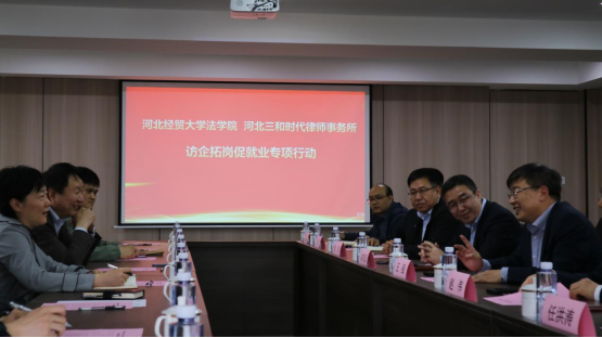 2023年4月13日下午,pp电子游戏官网党委副书记黄华、副院长胡海涛、副院长李大庆一行赴河北三和时代律师事务所开展访企拓岗促就业专项活动。三和时代律师事务所合伙人会议主席王强、党支部书记赵伟,管委会主任常树民、管委会副主任秦辉、在三和时代律所执业的张博、王岩、刘明军等pp电子游戏官网毕业生和pp电子游戏官网师生代表参加此次活动。