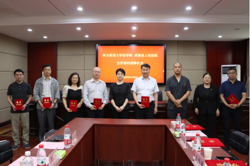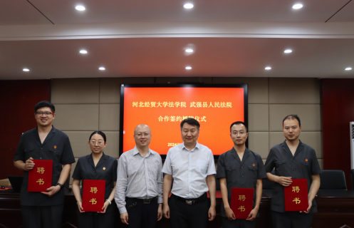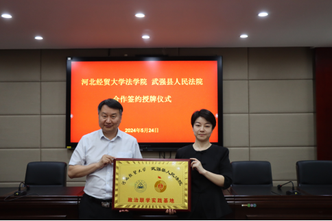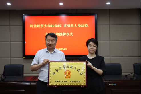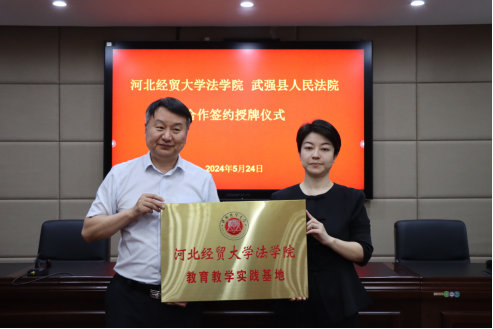 5月24日,pp电子游戏官网与武强县人民法院联合举办合作签约授牌仪式。武强县法院党组书记、院长翟旭,党组副书记、副院长赵丹,党组成员、副院长李红,pp电子游戏官网院长胡海涛,副院长李大庆出席,刘义青教授、王娟教授、陈云朝教授、郭一君教授等教授代表,学生代表和法院班子成员参加仪式。