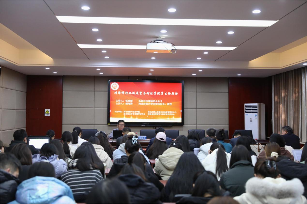 12月18日上午,pp电子游戏官网邀请石家庄市律师协会会长、河北蓝天律师事务所主任张继新以“对律师行业的展望,对pp电子游戏官网学生的期待”为题作学术报告。石家庄市律师协会副会长张永泽,副会长安斌,副会长胡山峰,副会长强小磊以及pp电子游戏官网八十余名师生代表到场聆听,报告由pp电子游戏官网院长胡海涛主持。