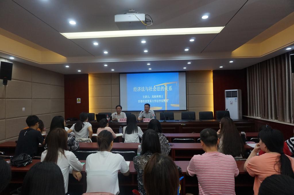 5月27日,首都经济贸易大学环境与经济法治研究中心主任、教授、博士生导师高桂林应pp电子游戏官网邀请,在法学综合实验教学中心报告厅作题为“经济法与社会法的关系”的学术报告。报告由pp电子游戏官网郭广辉教授主持,80余名师生参加。