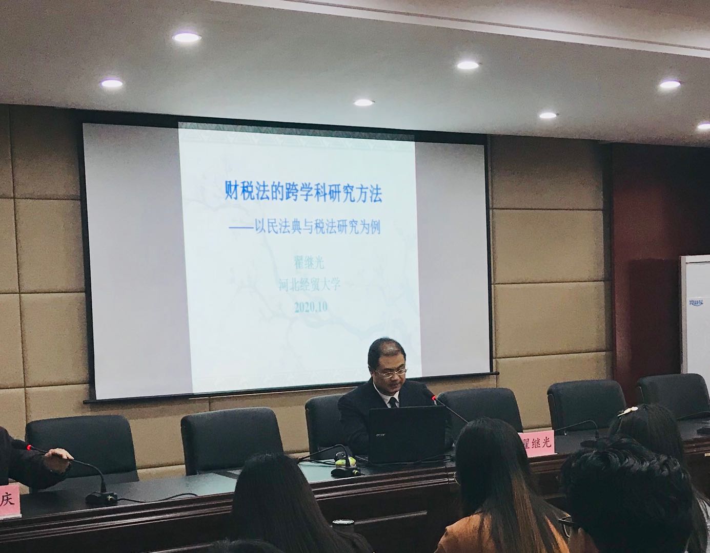 翟继光副教授首先介绍了财税法与宪法、民法、刑法、诉讼法等各部门法的关系,接着对《民法典》总则编、物权编、合同编、人格权编、婚姻家庭编、继承编、侵权责任编的相关规定中隐含的税法问题作了列举性讲解。他指出,财税法的跨学科研究方法是其自身特点决定的,财税法本身就是多个法律部门交叉形成的领域,最适宜采取跨学科研究。他强调,《民法典》的实施将对税法理论和税法制度产生重大影响。讲座最后,翟继光与同学们就居住权课税等问题进行了交流,回答了同学们的提问。
