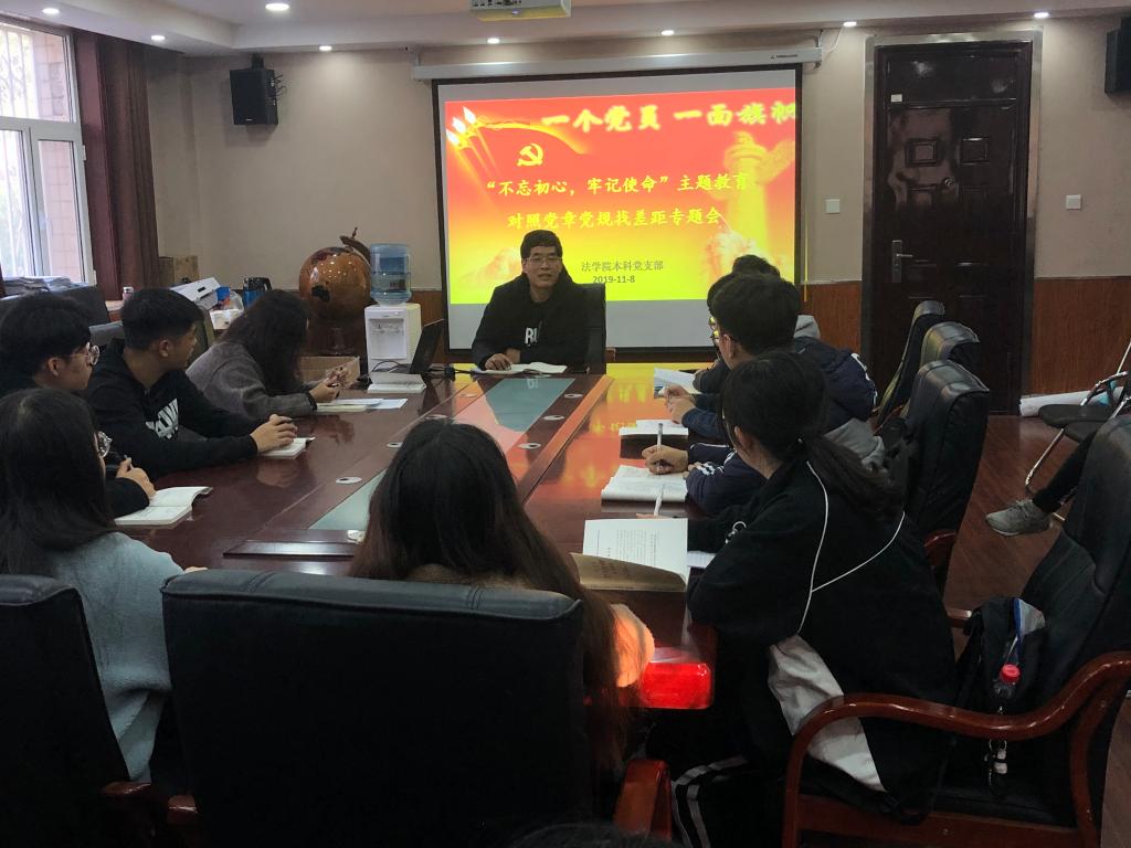 为认真贯彻落实“不忘初心、牢记使命”主题教育精神,pp电子游戏官网本科党支部于2019年11月8日下午在第二办公楼会议室召开了“对照党章党规找差距专题会”。专题会由pp电子游戏官网本科生党支部书记杨景老师主持召开,学院党委书记武玉鹏出席了本次专题会,支部全体党员参加了本次会议。