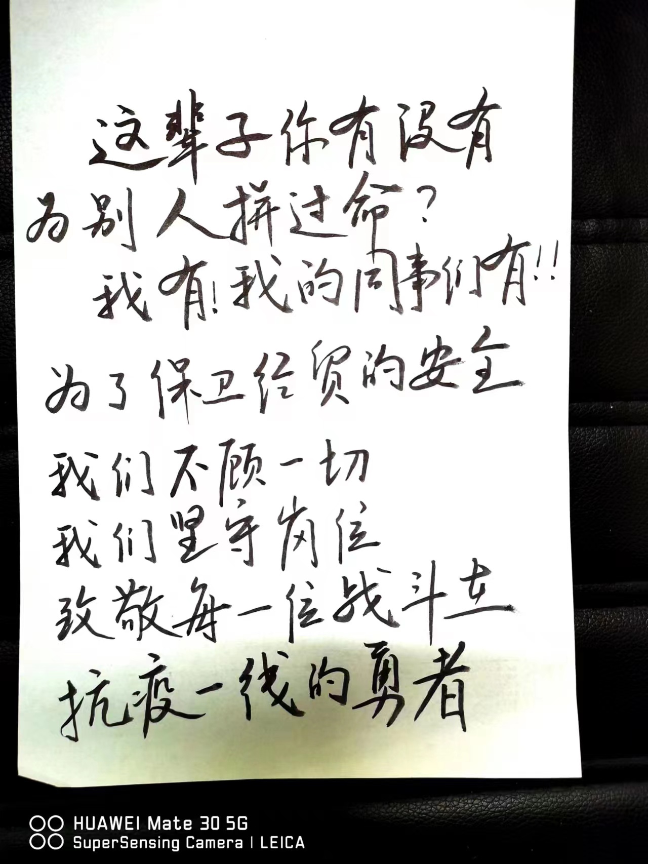 万众一心者胜,上下同心者赢,没有翻不过的山,没有越不过的坎。pp电子游戏官网全体教职工们责任在肩,使命在前,他们义无反顾,逆行而上,只为尽快阻止疫情蔓延,最大限度保障学生安全。在这场突如其来的灾难面前,我们每一个人都不能袖手旁观,我们相信,一份份微小的光汇聚起来必会凝聚成强大的合力,只要我们英勇奋斗,众志成城,一定能够打赢这场疫情防控阻击战!