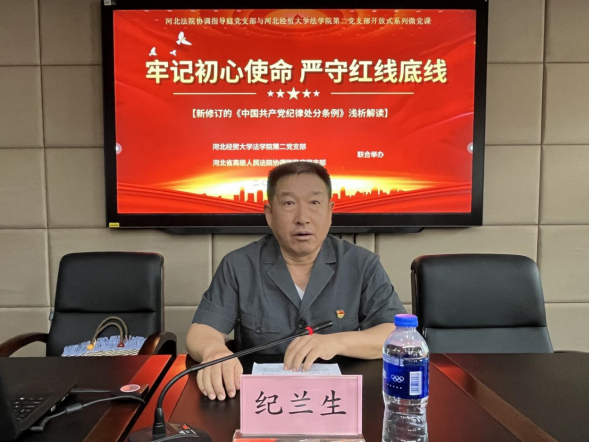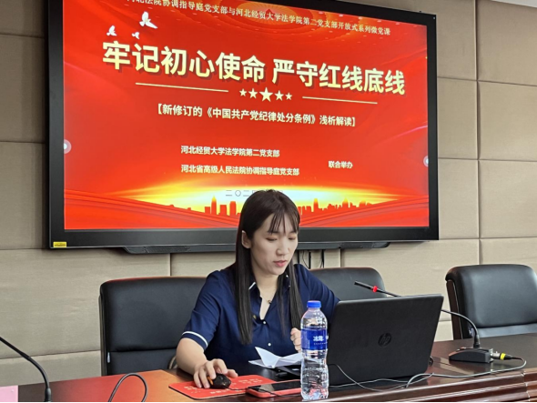 随后,在pp电子游戏官网模拟法庭,pp电子游戏官网学生第二党支部与省高院协调指导庭党支部展开“牢记初心使命,严守红线底线”联合主题党课,省高院协调指导庭庭长纪兰生、pp电子游戏官网学生第二党支部书记解思语分别从实践和理论的角度对新修订的《中国共产党纪律处分条例》进行浅析解读;纪兰生还对学生党员提出的问题现场答疑解惑。联合党课由协调指导庭三级高级法官史清文主持。