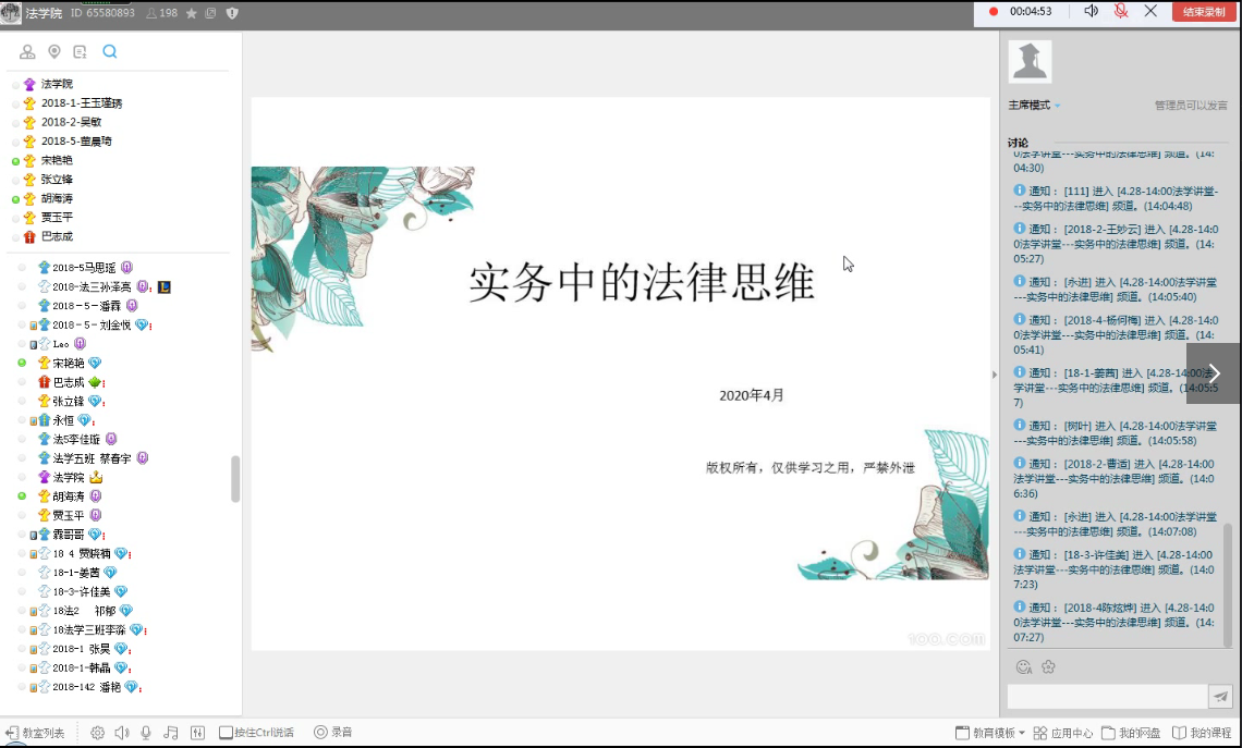 4月28日下午,pp电子游戏官网邀请优秀校友96级国际经济法本科班的宋艳艳律师,在学院yy65580893频道举办了一场题为“实务中的法律思维”教学沙龙活动。