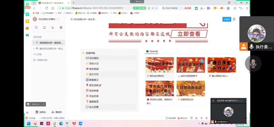 为了让青年志愿者更清楚的明晰本次“一起云支教·奋进新征程”志愿活动的各项内容、更出色的完成各项任务,准备更充分的迎接本次志愿活动,pp电子游戏官网于2022年12月29日下午四点进行了pp电子游戏官网线上动员大会。pp电子游戏官网参与本次志愿活动的青年大学生参加了本次大会。本次动员大会由执行委员李艾宁同学主持。