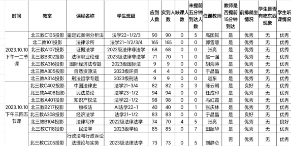 教学运行总体情况良好。检查组安排27名工作人员分别到各个教室,对10月10日下午的上课情况进行了全面检查,共检查15个教学班。教师们教学准备比较充分,能够按时到岗上课;学生按时到课,上课情况良好;多媒体设备、实验室设备等教学设备一切正常。