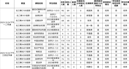 教学运行总体情况良好。检查组安排27名工作人员分别到各个教室,对10月24日下午的上课情况进行了全面检查,共检查15个教学班。教师们能提前到达教室并打开PPT,授课思路清晰,课程的重难点突出,设计饱满合理。各个班级的学生能积极前排就座,主动回答问题,课堂氛围活跃,学生听课状态优秀。