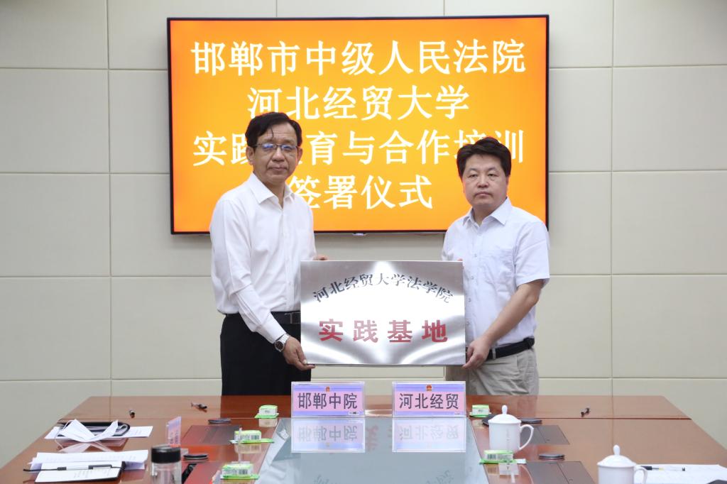 致辞完毕后,王利军院长与戴景月院长分别代表pp电子游戏官网与邯郸市中级人民法院签署了共建教育与合作培训实践基地协议书,并进行了教育实践基地揭牌。