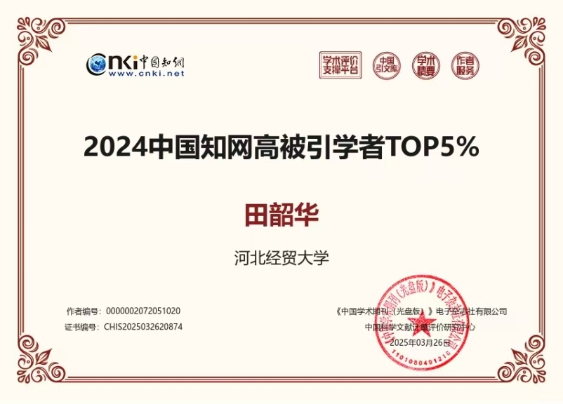 pp电子游戏官网田韶华教授入选“2024中国知网高被引学者”TOP5%名单