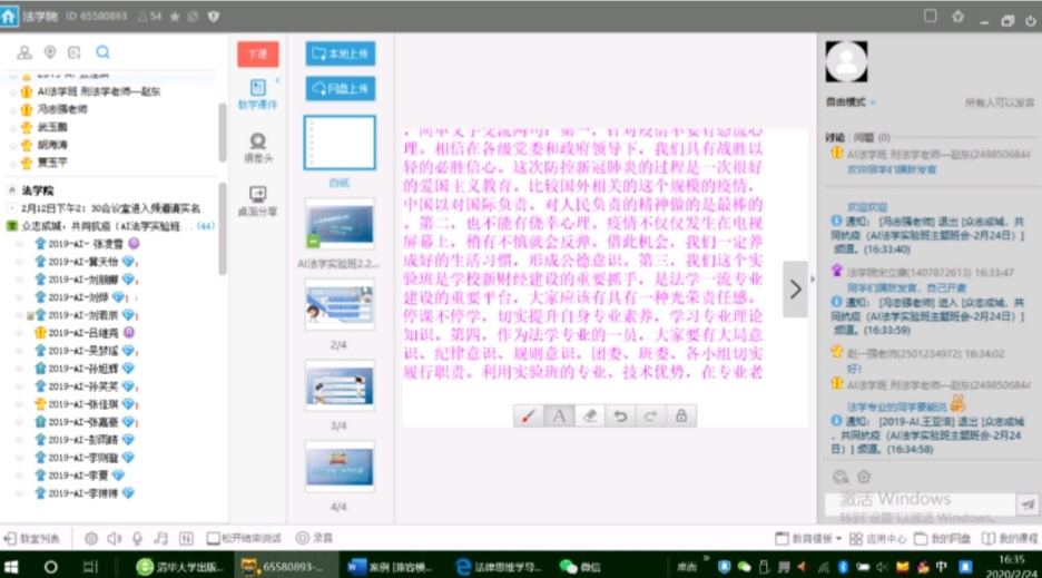 2020年2月24日,AI法学实验班通过yy语音平台召开了一次别开生面的“众志成城、共抗疫情”主题班会。在这个举国上下共抗新冠疫情的特殊时期,pp电子游戏官网师生的情感沟通并没有被分隔两地不能相聚校园的现实所阻碍。班会上不但全体同学早早到了pp电子游戏官网yy语音频道,学院党委书记武玉鹏、班主任胡海涛,宋立赓、冯志强、赵一强、赵东等老师等听说线上班会的消息后,都赶来参加班会,与同学们分享假期收获并体验线上教学的感受。