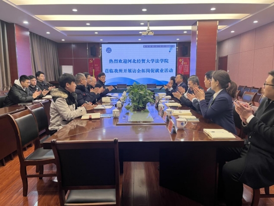 2023年12月22日,pp电子游戏官网党委书记王继伟,副院长李大庆,院务助理张亮,学工办主任陈运涛,辅导员梁贺超和研究生代表一行9人赴河北冀华律师事务所开展访企拓岗促就业活动。冀华律所管委会副主任商杰、陈建峰,行政主管张汉军和在pp电子游戏官网在冀华律所执业的钱程、柴瑜、陈昭静、刘俊廷、韩曈曈等五名校友代表出席本次活动。
