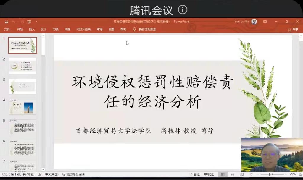 高桂林教授以“环境侵权惩罚性赔偿责任的经济分析”为题,从经济学的角度对环境侵权的惩罚性赔偿责任问题进行了系统全面的分析。高桂林教授以民法典中五条环境保护相关法律为抓手,通过讲法条、举例子的方式展开自己对本次讲座主题的认识,通过法条解析和案例介绍帮助与会师生领会到“新民法典是公平正义和追求效率并重的民法典”这句话的深刻内涵。高教授指出,生态环境的经济价值不可估量,环境惩罚性赔偿相关法规的社会意义突出,从金色的环境保护法到绿色的民法典,体现的是民法典对于公平正义和效率并重的追求。