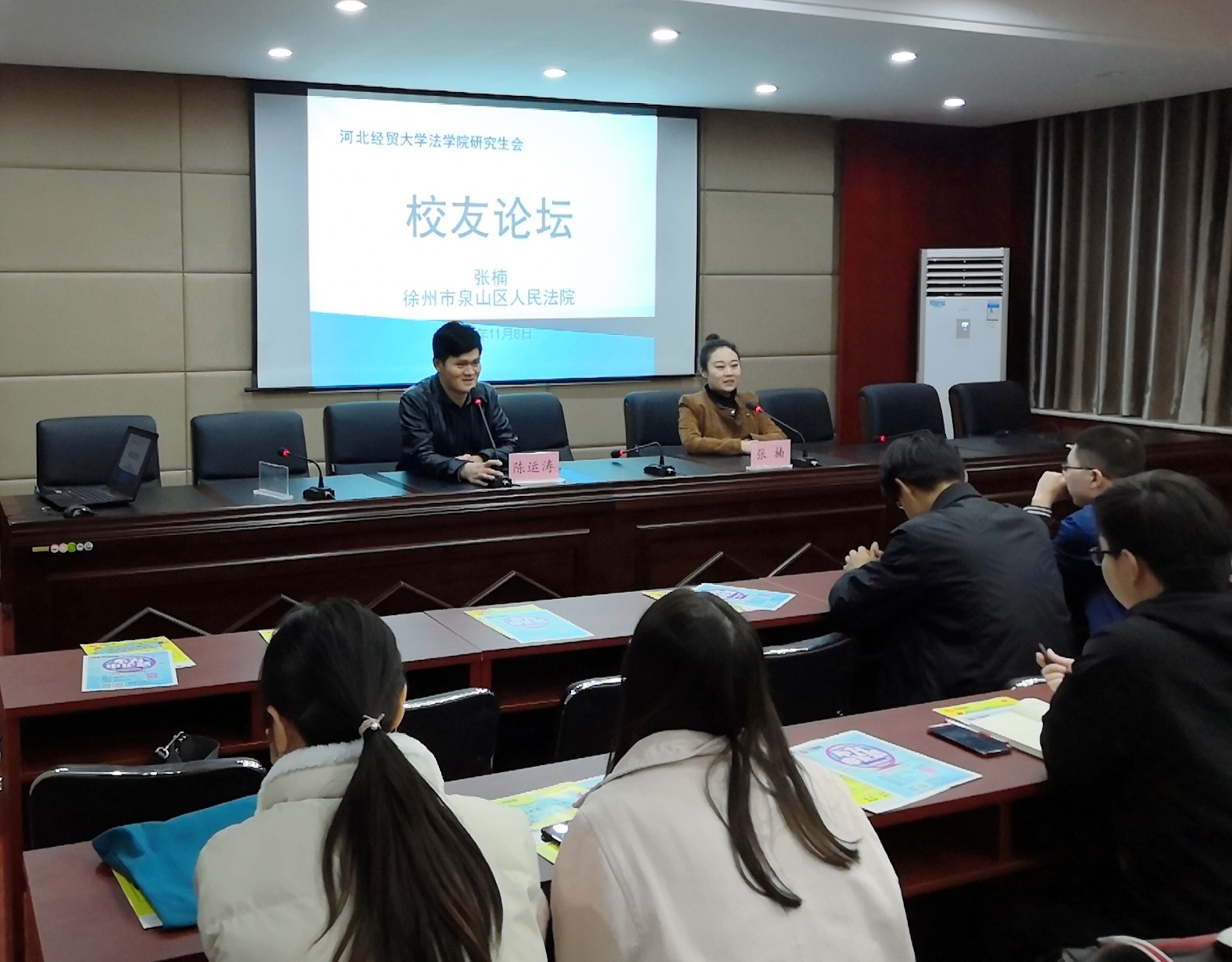 11月13日,pp电子游戏官网邀请了2018届优秀研究生毕业生、江苏省徐州市泉山区人民法院法官助理张楠做客“校友论坛”,pp电子游戏官网60余名研究生、本科生参加此次活动。活动由学院团委书记陈运涛老师主持。